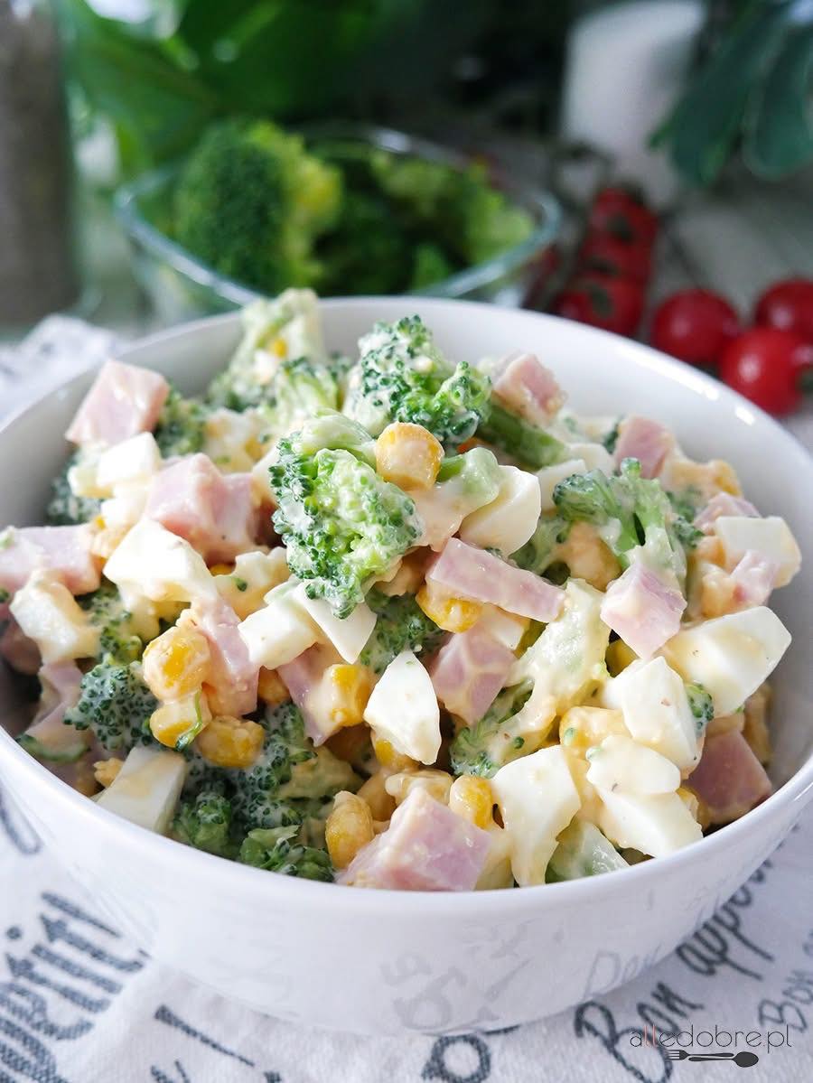 3. Łączenie: W dużej misce umieść różyczki brokuła, pokrojoną szynkę, jajka oraz odsączoną z zalewy kukurydzę. 🌽🥗
